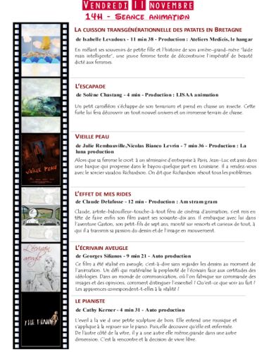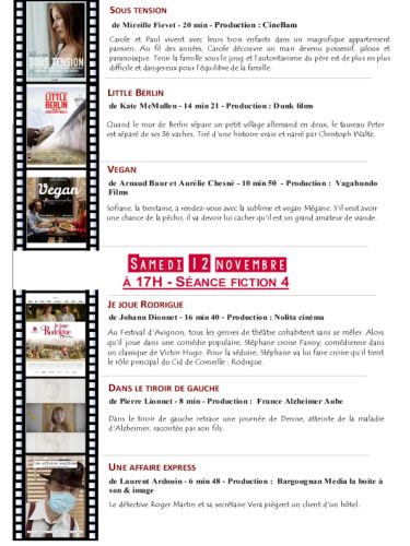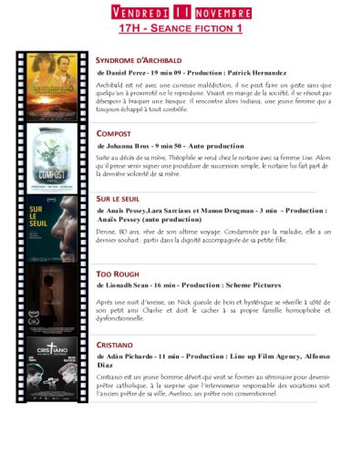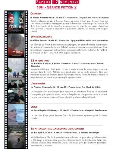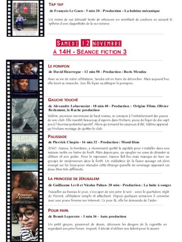 Vendredi 11 novembre, 14 h animation ; à 17 h, fiction ; à 19 h, lancement et vernissage de l’exposition Différences ; à 21 h, carte blanche quatre courts-métrages. Samedi 12 novembre, à 10 h, fiction ; à 14 h fiction ; à 17 h, diction. Dimanche 13 novembre, 10 h, fiction ; à 14 h, fiction ; 16 h, palmarès et clôture.