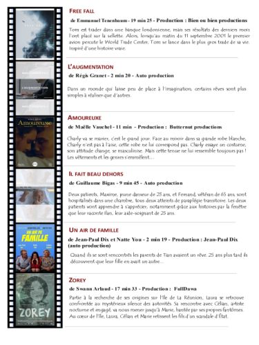 Parmi les 56 films en lice au Festival international du court-métrage, Ecran libre, qui s’est déroulé les 11, 12 et 13 novembre, c’est le film Free Fall d’Emmanuel Tenenbaum, qui se déroule pendant l’effondrement du World Trade Center, qui obtient le 1er pprix, prix de la Saladelle d’or, attribué par le jury des professionnels du cinéma. Le syndrome d’Archibald de Daniel Perez, obtient le prix de la ville d’Aigues-Mortes ; Un cœur d’or, le prix du film d’animation, avec un accessit à La belle survie de Louis Besse ; le prix Grand Ecran pour tous, attribué à un premier film, va à Une grande nouvelle de Samuel Argentier. Le prix du public a été décerné à Poussières d’Alexis Duflot, touchant fortement l’assistance.